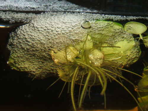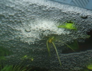 最初(大)の時、220数匹の稚魚が孵化して世話をしたわけですが、落ちてくる稚魚を巣に戻すという作業を休む暇無く続けていました。その時の泡巣がこれです。↓
