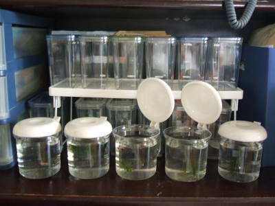 でも、現在は手前にある調味料入れを14個使って14匹単独飼育していたりするわけで。半日陰を求めてあっちこっちにチビ水槽(←水槽だなんておこがましい;)を移動させていたりします。