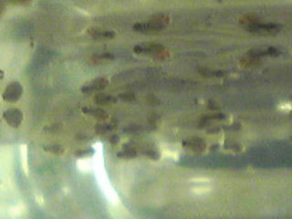 ベタ稚魚(小)は、沈んでしまったブラインシュリンプを水槽の底で食べ、おなかが一杯になると揃って水面で休んでいます。不思議。「ボウフラ飼ってるみたいだな」と、ダンナに言われてしまいました。うえぇー? と文句を言いかけて、確かにそうかもと思ってしまったり。(^_^;) 水面がビッシリになっているのを見ると、既にこれで水槽は小さめなような気も。