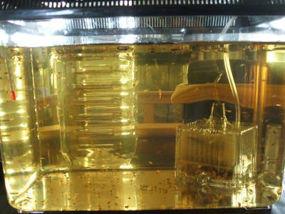 投げ込み式の濾過器は暴挙っぽく見えますが、空気の量を少なくしているせいか、ベタ稚魚(小)、自由に出入りしています。むしろ吸い込まれて集まった餌を食べに行っていたりします; 濾過もホントに緩い効果しか上がっていないかも。でも、あまり強くはできないし。ドキドキしながら使用中です。