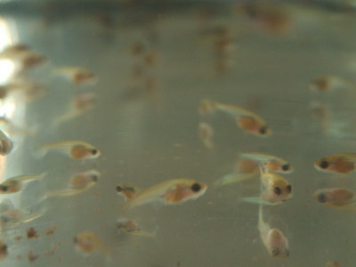 ちょっとは理解した! 大きい個体は数匹2.5cmほどに育っている個体もいます。よーし、見分けてやる! と意気込んで稚魚水槽を観察してみました。