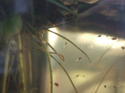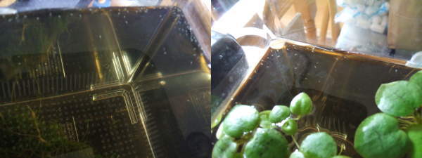 なんだか数が多いような気がして、デジカメで水槽の左側と右側の水面を撮ってみました。(小さくしか載せられないので数えられないだろうと、もっと小さくしてあります; 白い点が稚魚です)