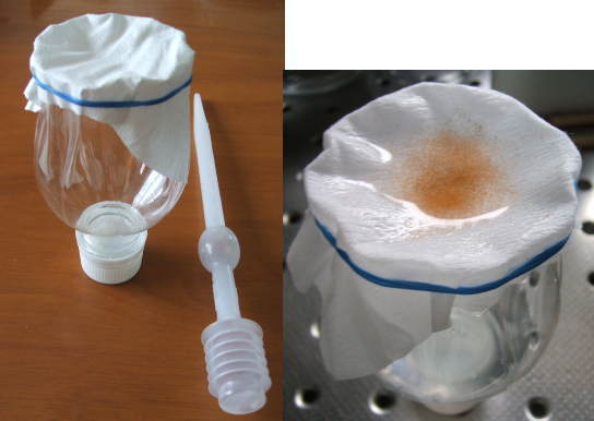 500mlペットボトルを半分に切って珈琲フィルターを輪ゴムで留め、中央をくぼませたモノです。塩水ごと吸い取ってフィルターで漉し、キャップを外して中に溜まった塩水を捨てて、ブラインシュリンプのたまったところを稚魚のいる水槽の水面にチョンとつければOKなのです。簡単な割に楽でいいです。