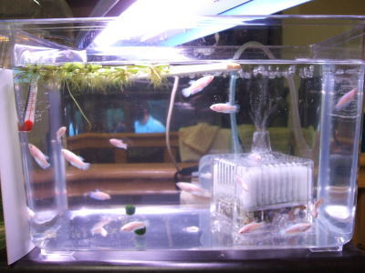 最初に10数匹しか見あたらなかったので、どこかで全滅させてしまうかもとドキドキでした。でも、なんとか元気に育ってくれています。しかも一匹も落ちてないところが驚きです。その上、ベタ稚魚(大・小)の時よりも大きくなるのが早いです。ちょっとはお世話も上手くなっているのかなと思ったり♪ や、成長が早いのは、赤虫への切り替えが早かったからだと思いますが。(^ ^;)ゞ