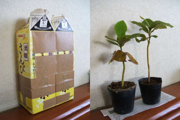 画像を見ていただければ、どのくらいの大きさかよく分かっていただけるかと。牛乳パックに入って、はるばる沖縄から送られてきたのです。しかも一番下に付いている葉は双葉です。そんな苗木なので、収穫できるようになるまでに、どのくらいかかるか分かりません。しかも、プランターキラーな私。これから冬季突入ですし、危険この上ないです。