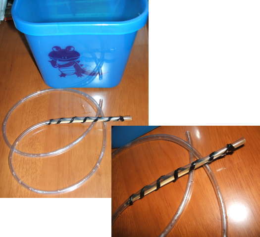 バケツはジュースを買ったときに付録に付いていた0円(タダ♪)の小さなバケツです。チューブは投げ込み式濾過器に使われるチューブ(残り物)です。で、チューブの先は竹串を添わせて電気のコードを束ねていた針金入りのテープでクルクルと固定してあります。うん。準備オッケー。